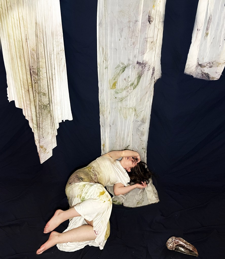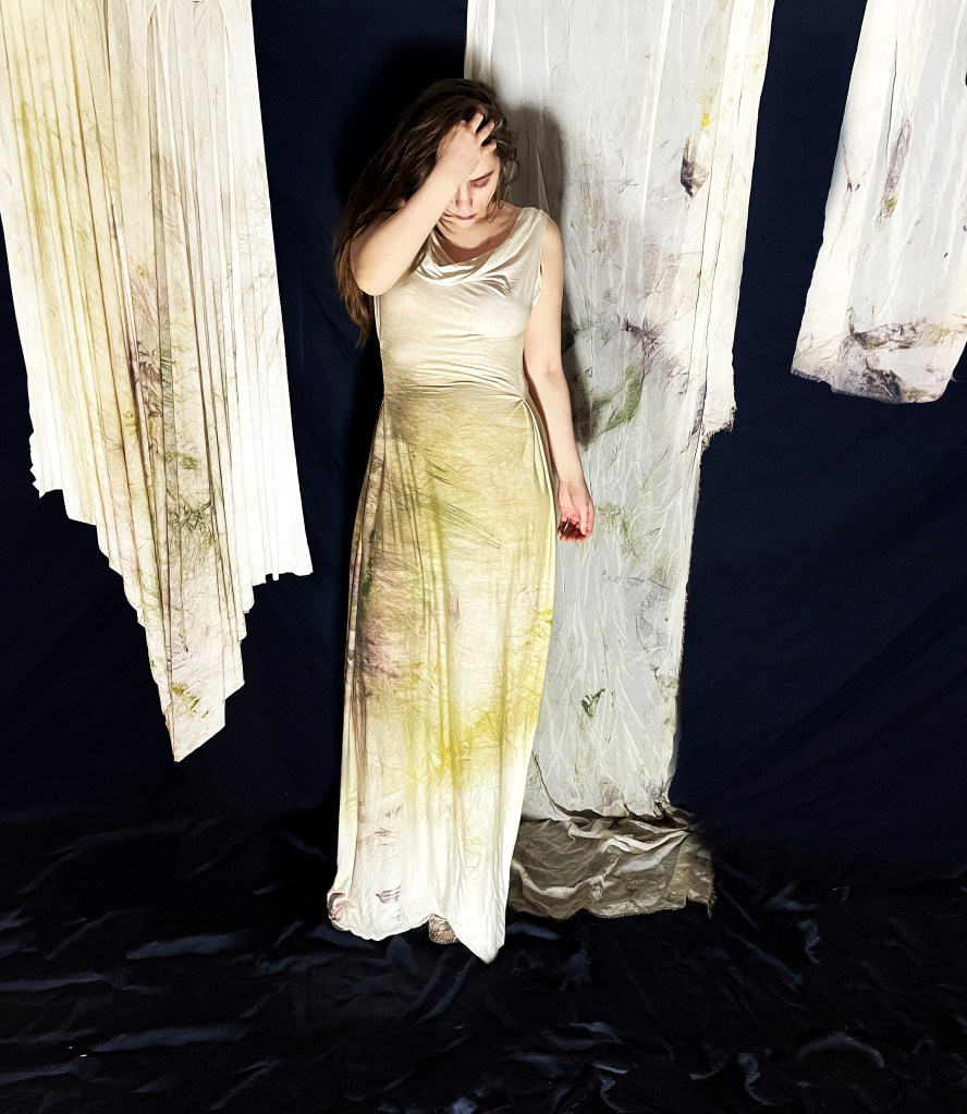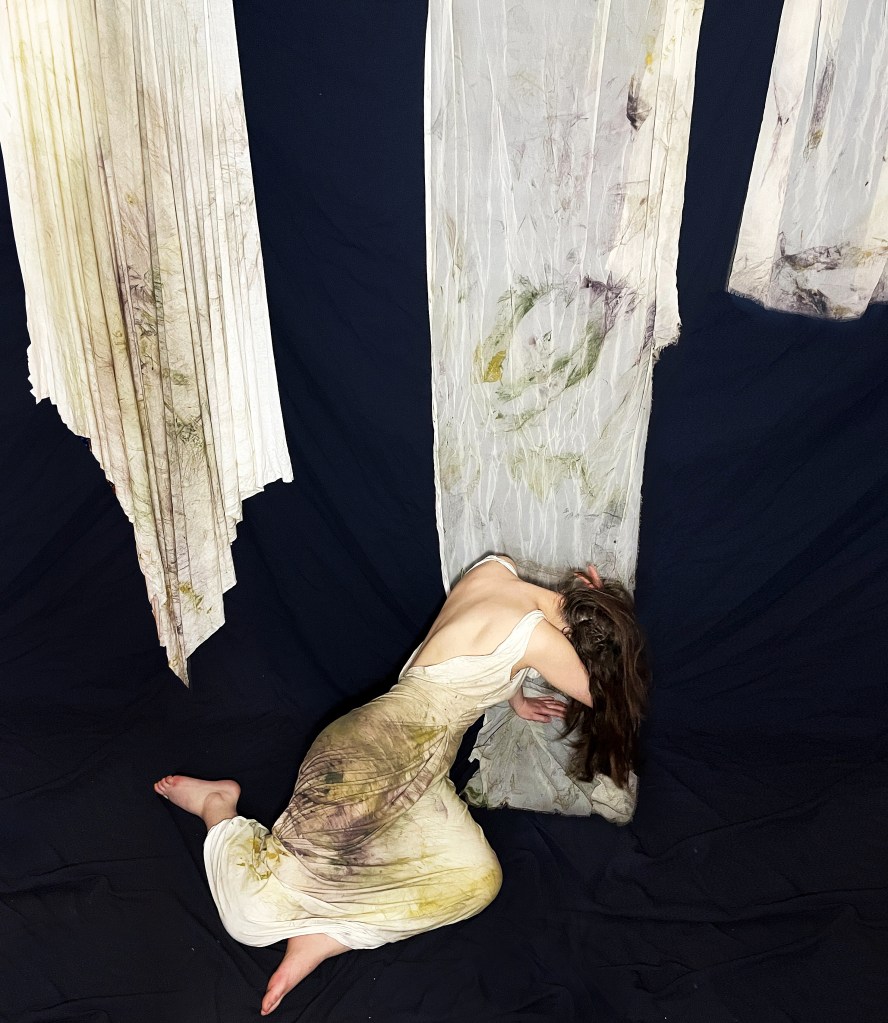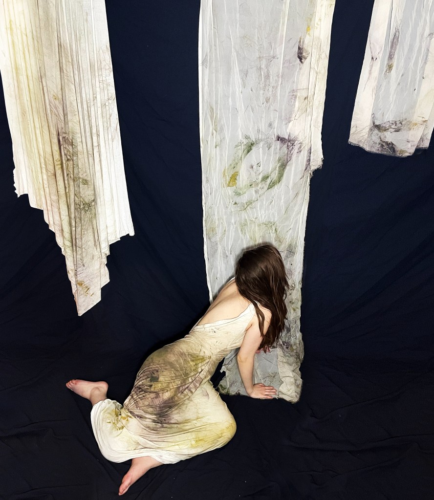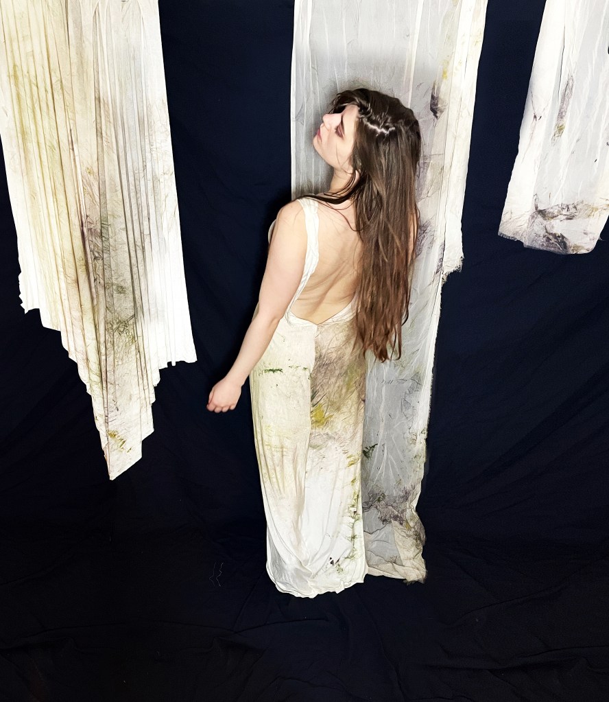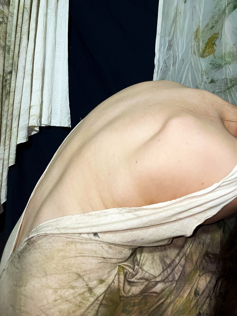 One of the most debilitating and invisible elements of my illness is the sheer amount of time I spend laying down. Due to this, I’ve been fermenting about how I might be able to make art of this time that is so relevant to my everyday experience of life. This project held the answer; I decided I would make a formal dress out of fabric I had slept in while wearing body paint, thereby bringing to the surface this invisible time I have to manage every day…. In the middle of the night, I mixed the body paint into three bruise colours, the deep purple, sickly green, and putrid yellow that bruises go as they heal. I decided on bruise colours as a universal depiction of hurt and wrong. I also thought bruise colours would add an element of the grotesque. Illnesses are often disgusting, in ways that aren’t appropriate for public consumption, yet the colours of bruises have a unique beauty that straddles the line between the grotesque and glamorous. I also put thought into the placement of the bruise colours, situating the darkest purples in the problem areas of my body, and moving outward from there with the green and yellow to fill in the gaps…